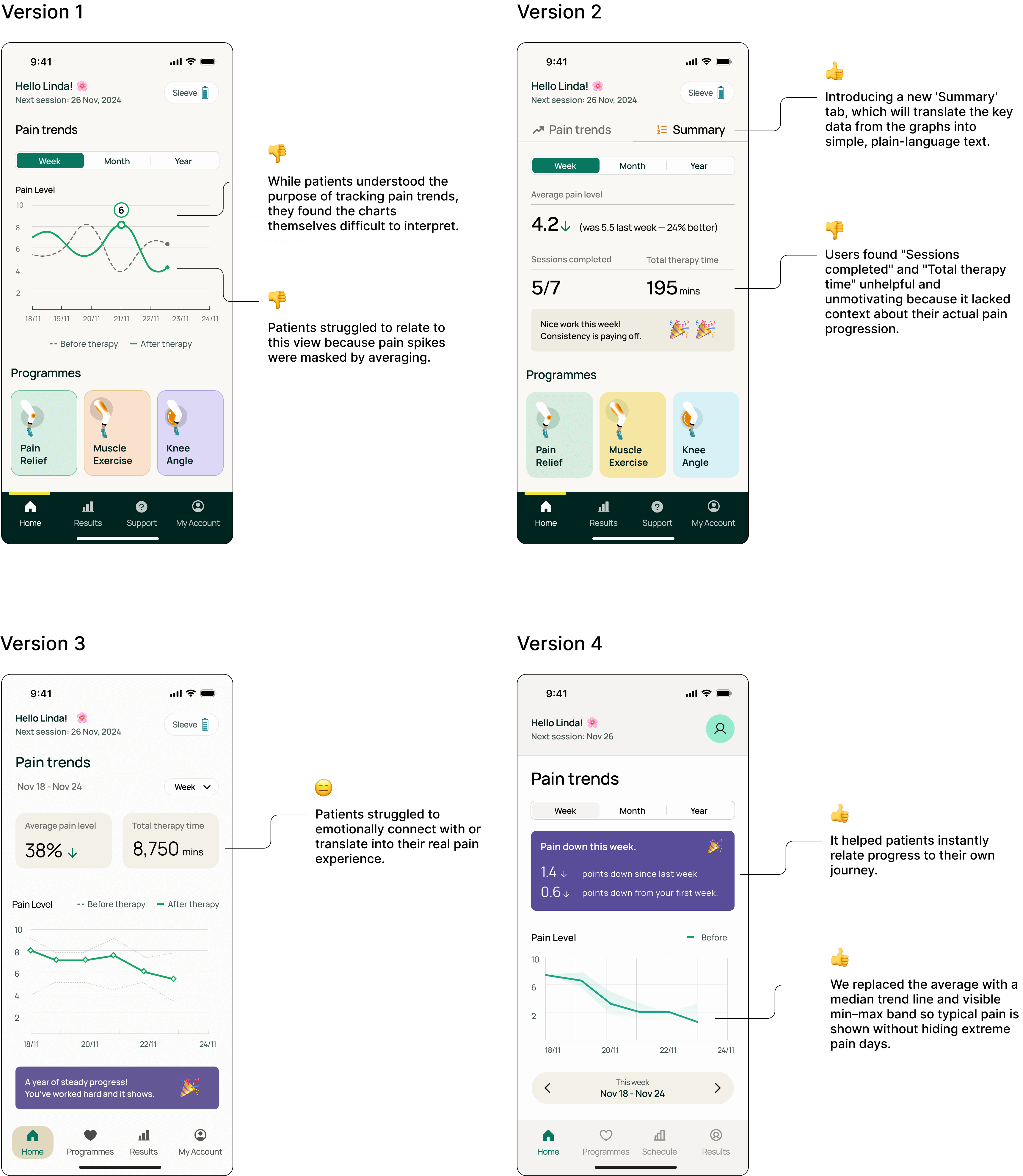 So, I made a conscious decision to kill overt rewards and instead design motivation around clinical progress, using pain trends, comparative insights, and subtle reinforcement messaging. This aligned better with both patient psychology and trial goals, strengthening first-session confidence and supporting sustained adherence through meaningful, not artificial, motivation.