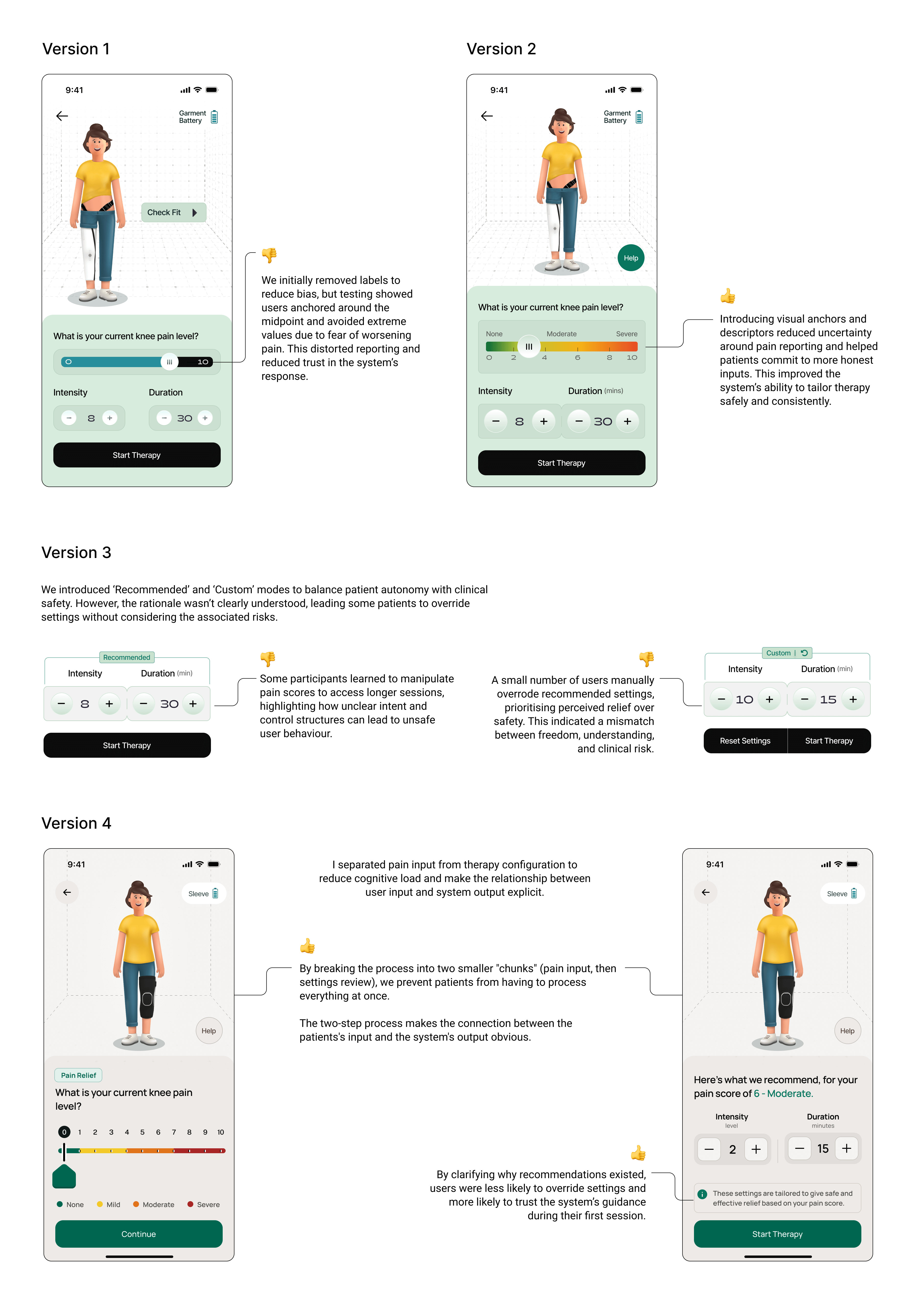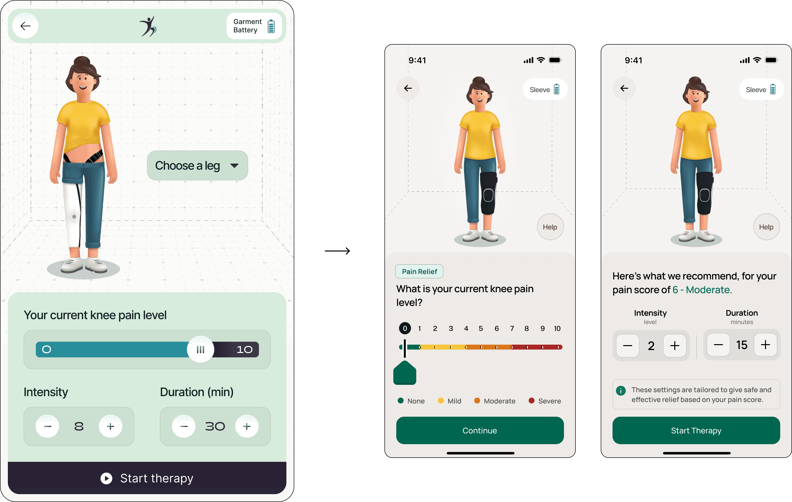 This iteration directly addressed Insight 2 by shifting from raw control to guided control. Instead of letting users guess or override blindly, I broke the flow into pain input followed by explained recommendations, making the system’s logic visible. This reduced anxiety around settings, prevented unsafe adjustments, and built trust in the device during the first session, which is essential for improving long-term adherence.
