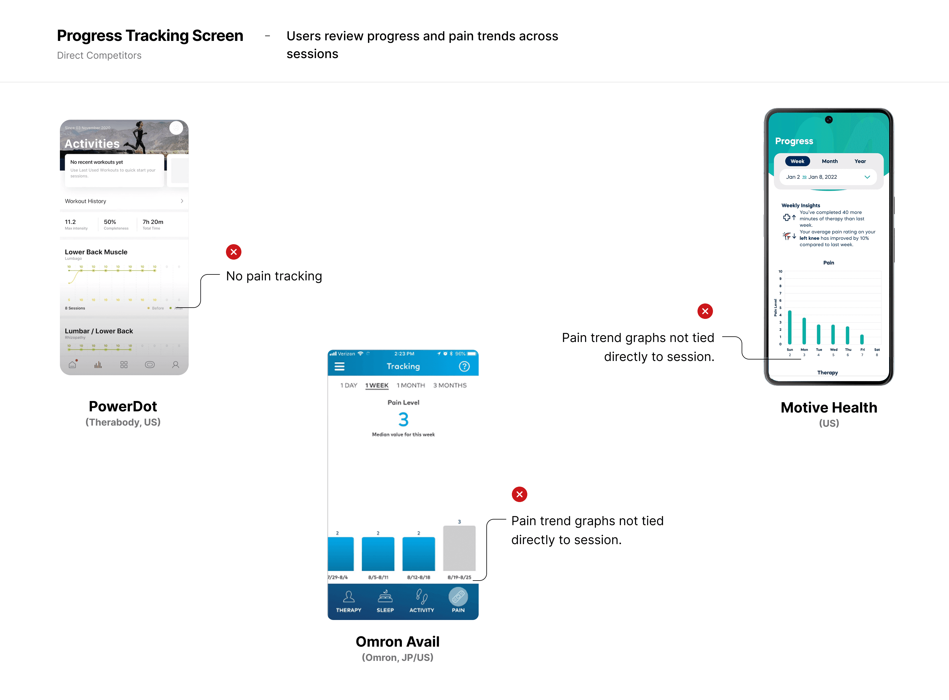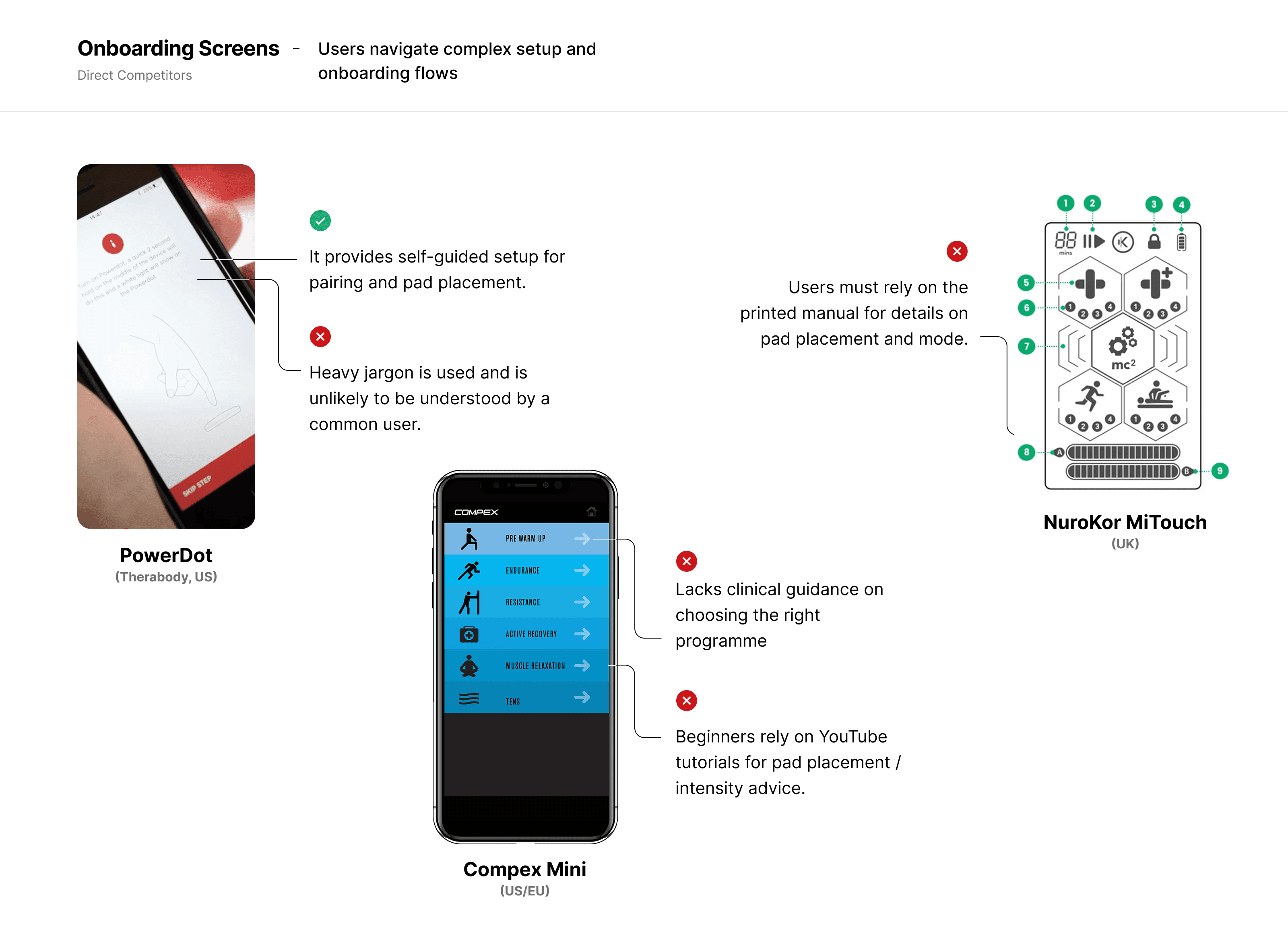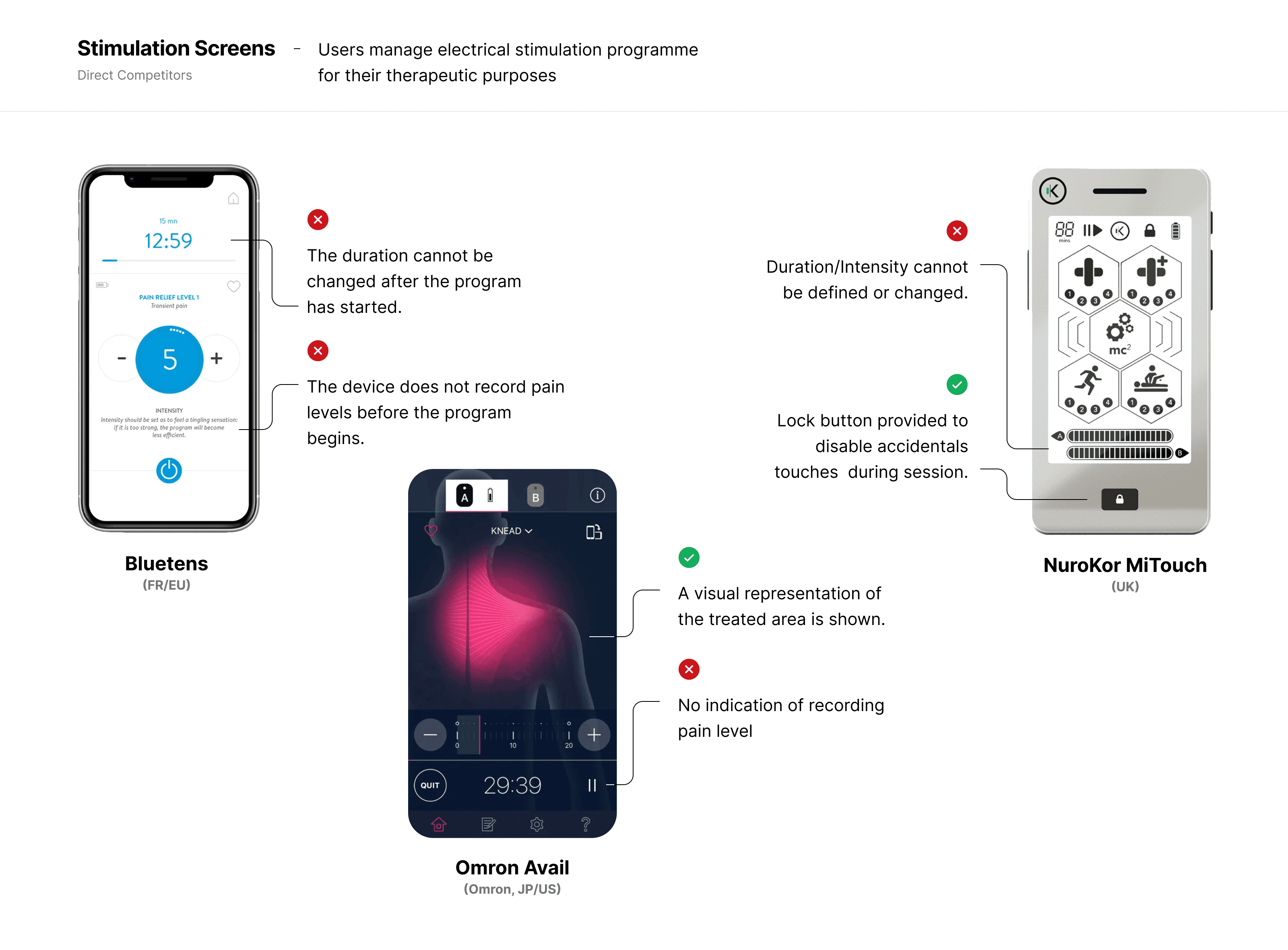 Initial discussions with stakeholders focused on reviewing global electrotherapy apps to understand industry standards. I realised that relying on these comparisons risked misaligning our design with our low-digital-confidence user base, as the few existing UK products only tangentially addressed chronic knee pain and most international apps targeted fitter, more confident users.