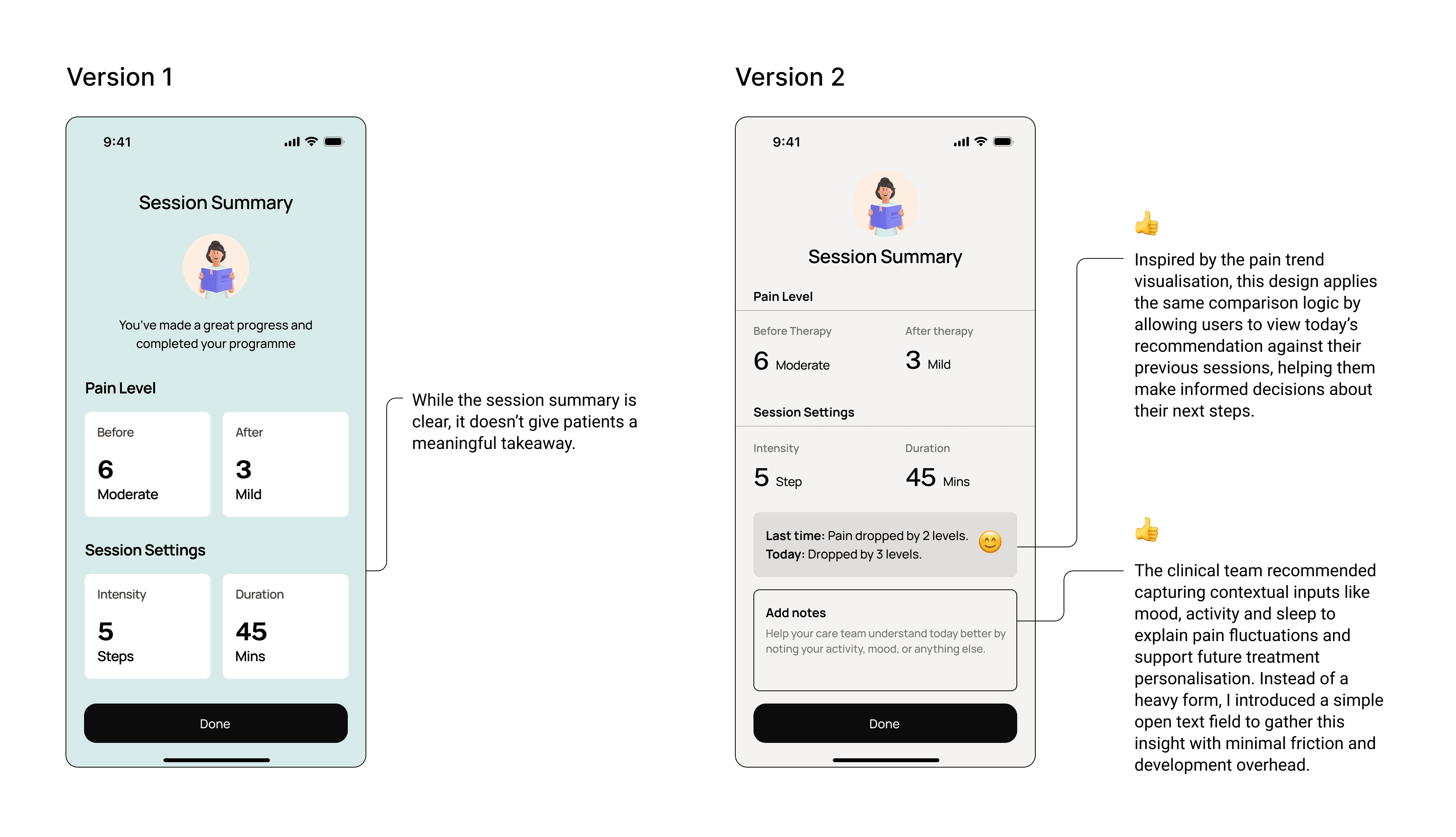 In the second version, I reframed the summary as a confidence and continuity moment, not a closing screen. By comparing today’s outcome with the previous session and inviting light contextual reflection through notes, the interface gives users both clarity on what happened and agency over what happens next. This directly supports Insight 2 by reducing uncertainty, and reinforces first-session success as a foundation for continued adherence rather than a one-off event.